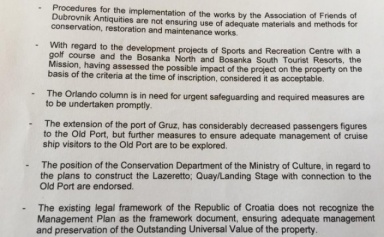 Osim toga, UNECO-ovi inspektori u izvješću ističu kako Društvo prijatelja dubrovačke starine obnavlja spomeničku baštinu neadekvatnim materijalima, i neadekvatnom tehnikom te preporučuju da se Orlandov stup hitno sanira. Osvrnuli su se i na stanje povijesne luke unutar zidina. Drže kako je proširenje luke Gruž smanjilo broj putnika koji se s kruzera iskrcavaju u starom portu, no kako u tom smjeru treba uložiti dodatne napore te podupiru projekt pristaništa ispod Lazareta. Neslužbeno, UNESCO po pitanju Dubrovnika namjerava proširiti zonu zaštite pa bi navodno u nju ušlo i područja Gruža.